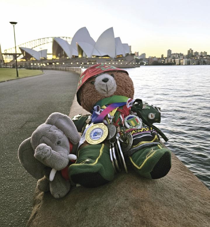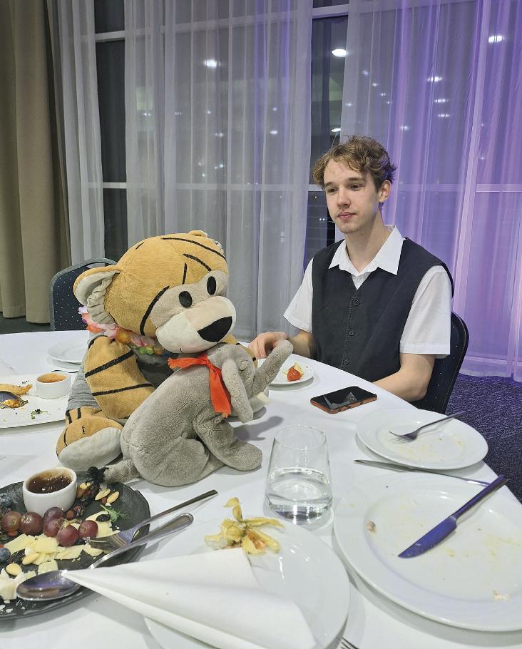 Ülemisel fotol on Eesti ja Lõuna-Aafrika matemaatikavõistkonna maskotid Vänt ja Chubby Sydneys, alumisel Eesti ja Saksamaa maskotid Vänt ja Mathematigerin koos Ervin Ivanoviga Balti Tee lõpubanketil. Fotod: ERAKOGU