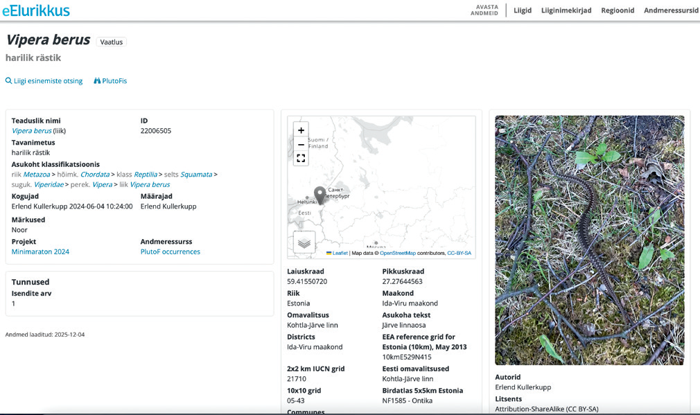 Elurikkuse veebilehe kuvatõmmis rästiku vaatluse andmetega