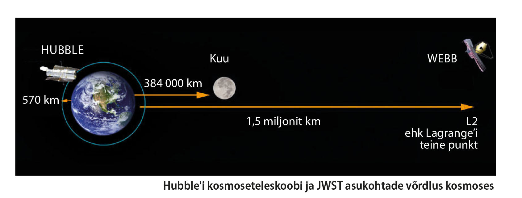 ­Hubble’i kosmoseteleskoop paikneb piltlikult öeldes koduõuel (kaugus Maast umbes 570 kilomeetrit), kuid JWST asetseb Maast ligikaudu 1,5 miljoni kilomeetri kaugusel, nn Lagrange’i teises (L2) punktis. Tegelikult ei paikne teleskoop täpselt L2-s, vaid tiirleb ümber selle perioodiga umbes 6 kuud ja kiirusega 1 km/s. Seejuures varieerub teleskoobi kaugus L2-st vahemikus 250 000 kuni 832 000 km ning maksimaalne kaugus Maast on umbes 1,8 miljonit kilomeetrit. Vajaduse korral korrigeeritakse teleskoobi asukohta iga 21 päeva tagant.