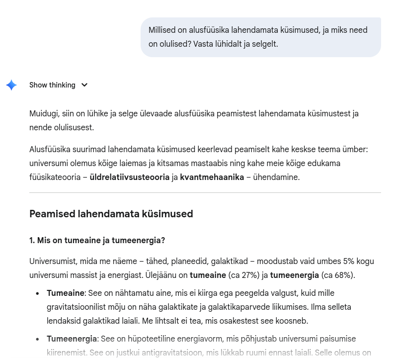 Tehisaru keelemudel suudab inimesega väga veenvalt vestelda. Näiteks küsisin tehisarult, millised on alusfüüsika lahendamata küsimused. Vastuseks sain, et need on tumeaine- ja tumeenergia olemus, üldrelatiivsusteooria ja kvantmehaanika ühendamine ja antiaine küsimus. Ehkki see on põhimõtteliselt õige, ei saa järeldada, nagu oleks tehisarul inimesele arusaadav ettekujutus, mida need mõisted tähendavad. Tehisaru ei mõelnud füüsika peale ega teinud eksperimente Euroopa tuumauuringute organisatsioonis (CERN) või kosmoses, vaid võttis kokku inimeste kirjutatud veebitekstid – teadusartiklid ja populaarteaduslikud tekstid – ning pakkus küsimusele statistiliselt tõenäolise vastuse, mis sellegipoolest on üpris õige ja vastab praegusele teadmisele.