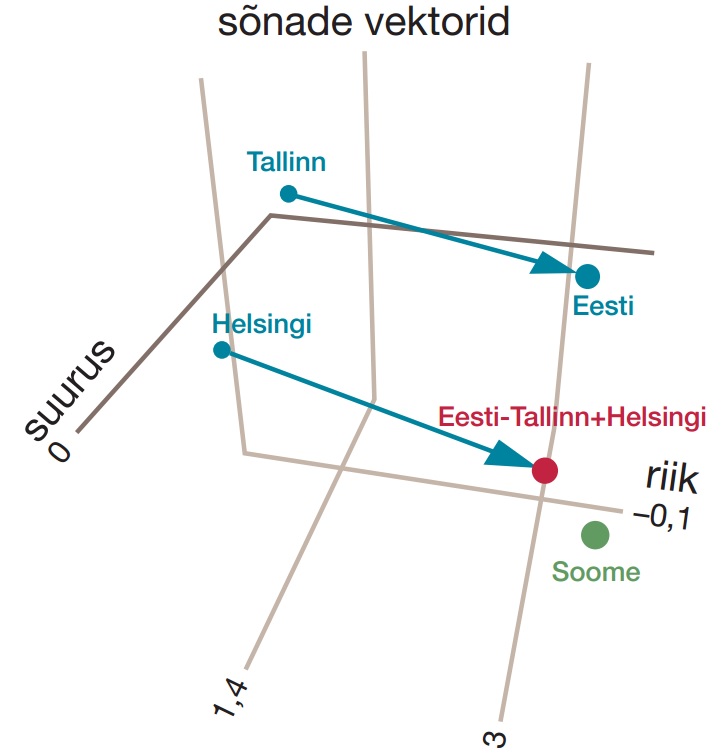 Suure keelemudeli sõnade asetus matemaatilises ruumis. Tehisaru mudel suudab noolte ehk vektorite liitmise ja lahutamise teel tuletada, et Helsingi seostub Soomega nii, nagu Tallinn Eestiga. Allikas: www.cs.cmu.edu/~dst/WordEmbeddingDemo/index.html
