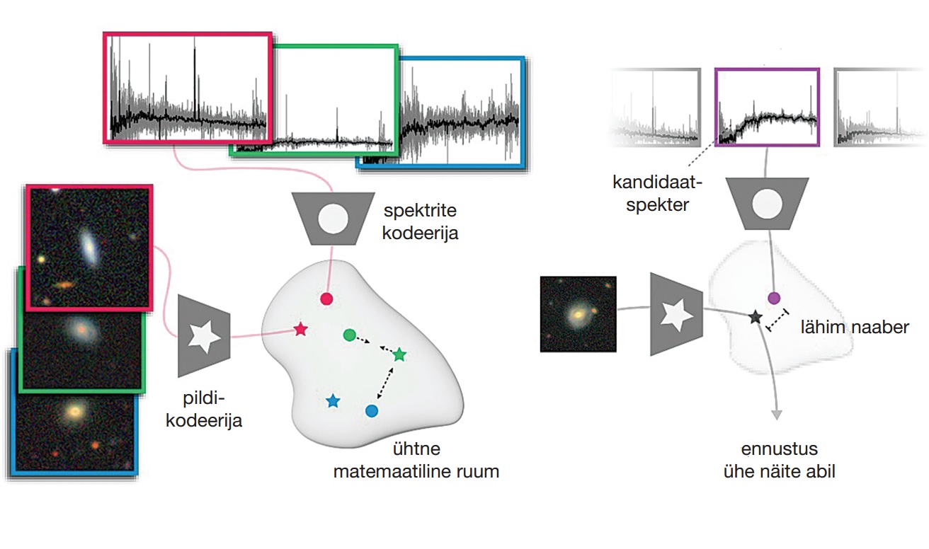 Simonsi instituudi teadlaste pakutud AstroCLIP-i mudel oskab panna galaktikate pildid ja nendele vastavad spektrid ühtsesse matemaatilisse ruumi. See tähendab, et tehisaru õpib statistilisel tasemel neid andmeid seostama. ALLIKAS: ARXIV.ORG/PDF/2310.03024