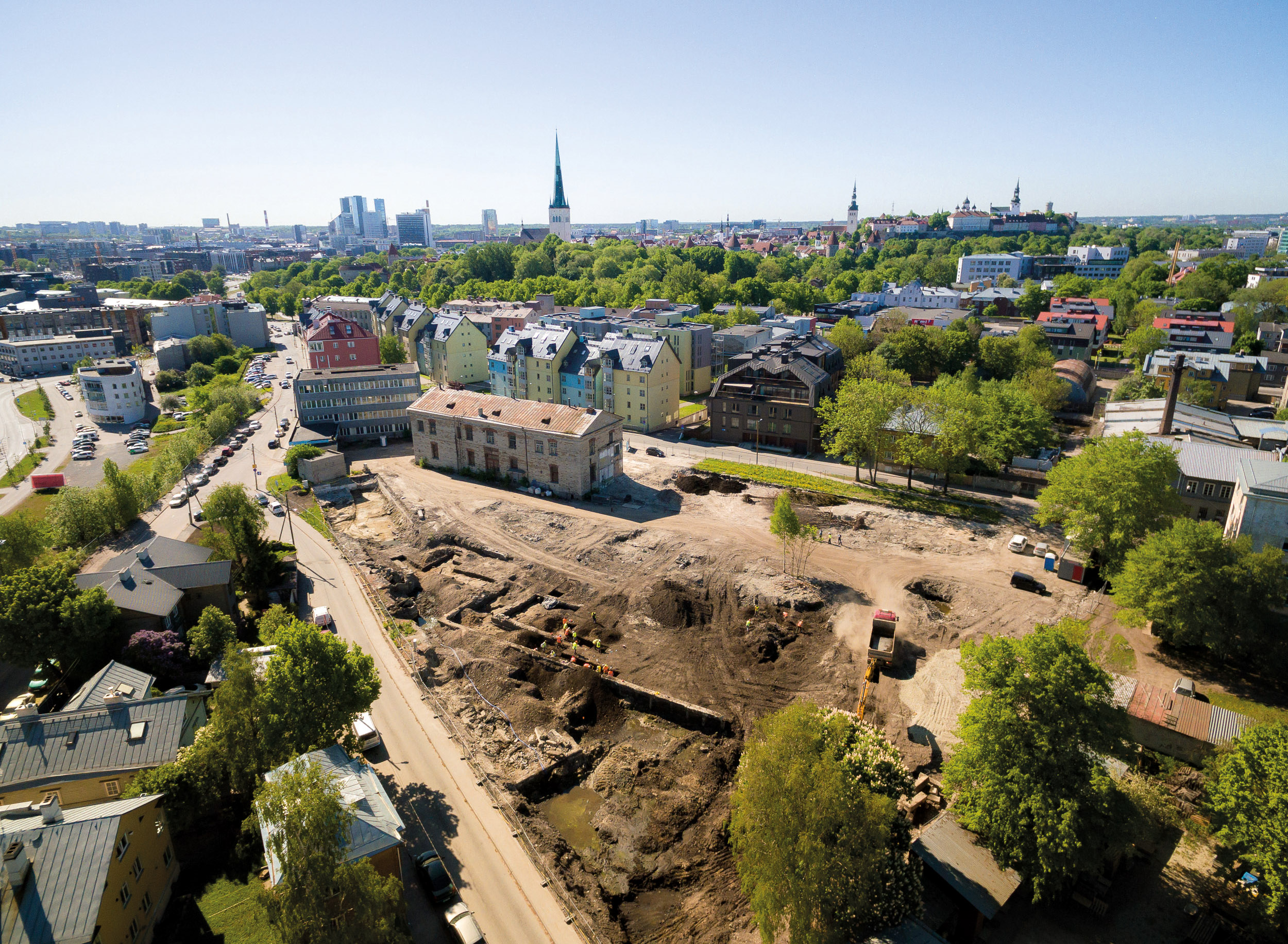 Õhufoto Jahu – Väike-Patarei tänava kvartali kaevamistest 2018. aasta mais. Kokku uuriti läbi 3000 m2 suurune ala. ANDRUS ANDERSON