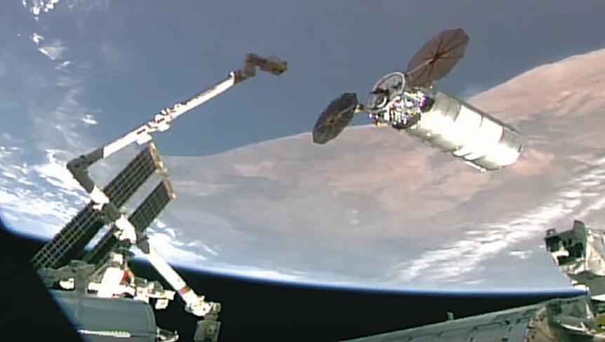 Et aidata põkkuda, on kosmosejaama ISS robotkäsi haaramas veolaeva Cygnus XL. NASA+