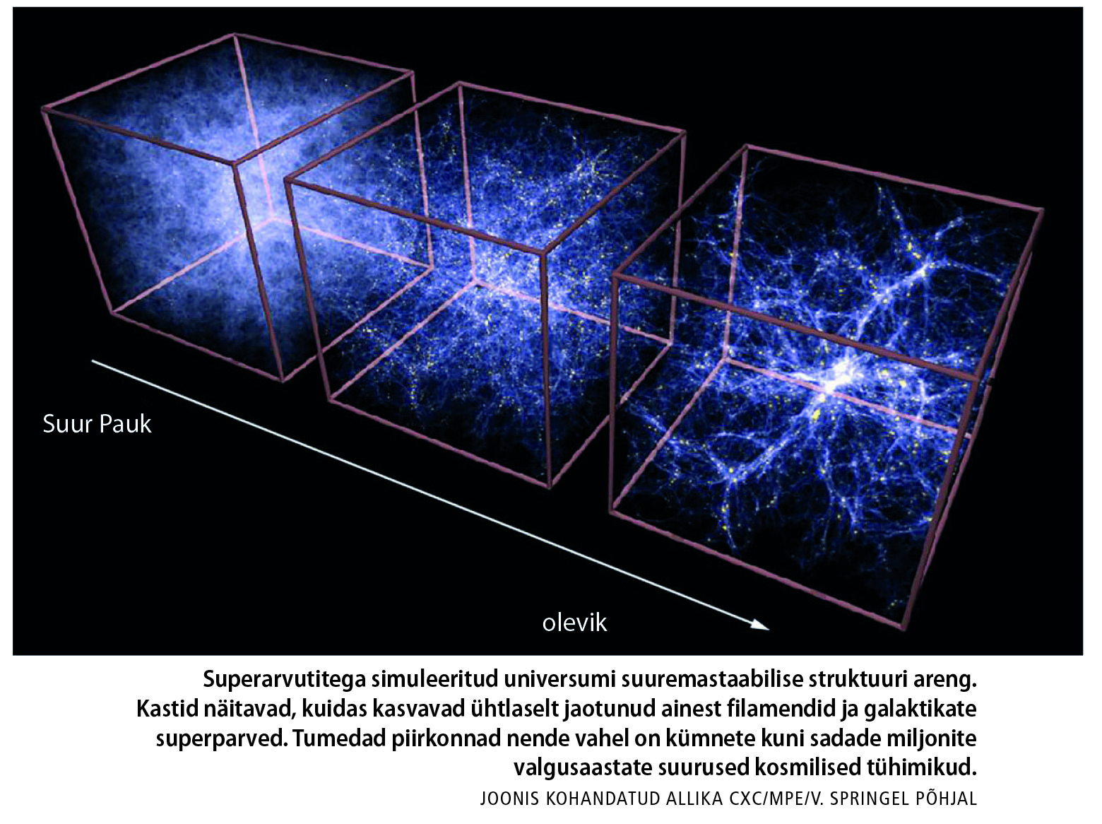 Tuleb tõdeda, et elame väga erilises kohas. Mitte seetõttu, et Maa on senini ainus kivimürakas, millel leidub meile teadaolevalt elu, vaid just seepärast, et siin üldse leidub midagi. Kui satuksime suvalisse kohta universumis, valitseks meie ümber peaaegu absoluutne vaakum, sest universumi ühes ruutmeetris leidub keskmiselt ainult viie vesinikuaatomi jagu ainet. Seda on 26 suurusjärku ehk 1026 korda vähem kui Maa atmosfääris. Meie ümbruses on aine seega äärmiselt ebaühtlaselt jaotunud. Enamik nähtavast ainest on koondunud taevakehadesse, nagu tähed ja planeedid. Need on kogunenud galaktikatesse ja viimased omakorda galaktikaparvedesse, mille suurus ulatub kümnetesse miljonitesse valgusaastatesse. Suuremates mastaapides paistab aine see-eest olevat jaotunud üllatavalt ühtlaselt. Astronoomiliste vaatluste järgi iseloomustab aine suuremastaabilist jaotust praegu kõikjal universumis nn kärgstruktuur, kus aine on kogunenud filamentidega ühendatud sõlmedesse ehk galaktikate superparvedesse, mida ümbritsevad kosmilised tühimikud.