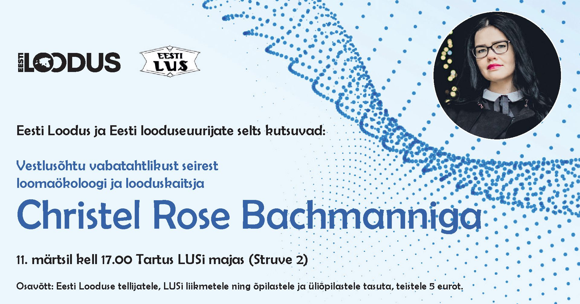 Ajakiri Eesti Loodus ja Eesti looduseuurijate selts kutsuvad 11. märtsil kell 17 vestlusõhtule, kus loomaökoloog ja looduskaitsja Christel Rose Bachmann räägib vabatahtlikust seirest ja huvist looduskaitse vastu. Vabatahtlikku seiret on Christel eest vedanud ja populariseerinud üle viie aasta. Kõige rohkem köidavad teda nahkhiired, keda ta uurib ka oma teadustöö raames.