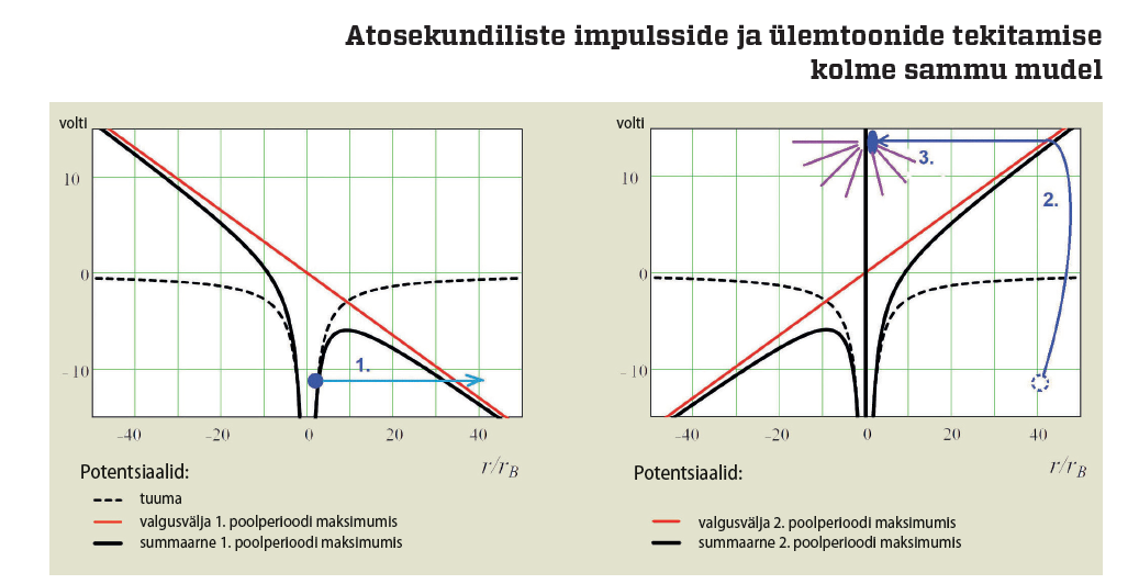 Kui uurida joonist põhjalikumalt, võib järeldada: piisavalt tugeva laseri- valguse korral moondub tuuma potentsiaal sedavõrd, et elektroni tuumast eemaldamiseks pole tunneliefekti vajagi: laseri elektriväli lihtsalt rebib ta toore jõuga tuumast eemale ja järgneval poolperioodil paiskab tagasi vastu tuuma. Kas sel juhul pole kvantmehaanikat vajagi? Jah, kuid esiteks, Nobeli auhinna vääriliste uurimuste tegemise ajal vähemasti nii võimsaid lasereid polnud. Teiseks, kas kvantmehaanikata ei kao ka protsessi ilu? Tegelikult n-ö korralikus kvantitatiivses käsitluses kirjeldatakse kogu protsessi läbinisti kvantmehaanika aparaadi abil, ehkki laserivalguse kirjeldus on jäetud klassikaliseks. Kuid ainult seniks… Nimelt on tippajakirja Nature Physics oktoobrinumbris ilmunud uurimus kõrgete har- mooniliste ehk ülemtoonide genereerimisest Mg:LiNbO3 kristallitükis, millele oli suunatud eriline valgusväli, nn ere muljutud vaakum (brigth squeezed vacuum). Me ei püüagi siinkohal avada selle sügavalt kvantoptikasse kuuluva termini sisu, kuid võtame teadmiseks, et sellise eksootilise valguse abil muutub kõrgete harmooniliste tekitamine oluliselt tõhusamaks.