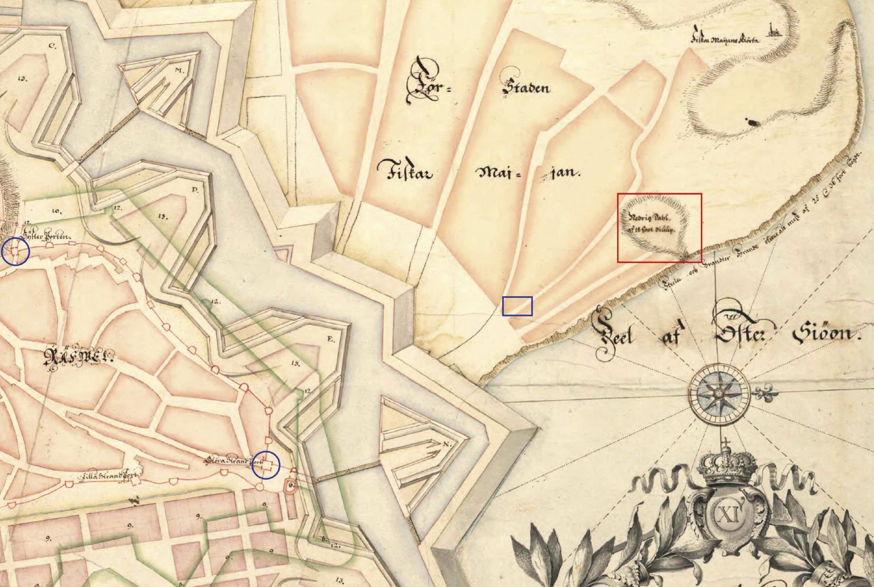 Lõige 1686. aastal valminud Tallinna kindlustuste projektist, millel on esile toodud Väike- ja Suur-Patarei tänava lääneosas paiknev org (märgitud punasega). Kalamaja keskaegse prügila asukoht (märgitud sinisega) jäi kvartali idaküljele, kus maapinnareljeef oli samuti ebaühtlane. Väike-Patarei tänava algus on siin kujutatud veel oma keskaegse koha peal. Sinised ringid rõhutavad linnaväravaid, mille kaudu pääses Kalamajja. ROOTSI RIIGIARHIIVI SÕJAARHIIV (KRA, SFP: ÖSTERSJÖPROVINSERNA. REVAL. 10A)