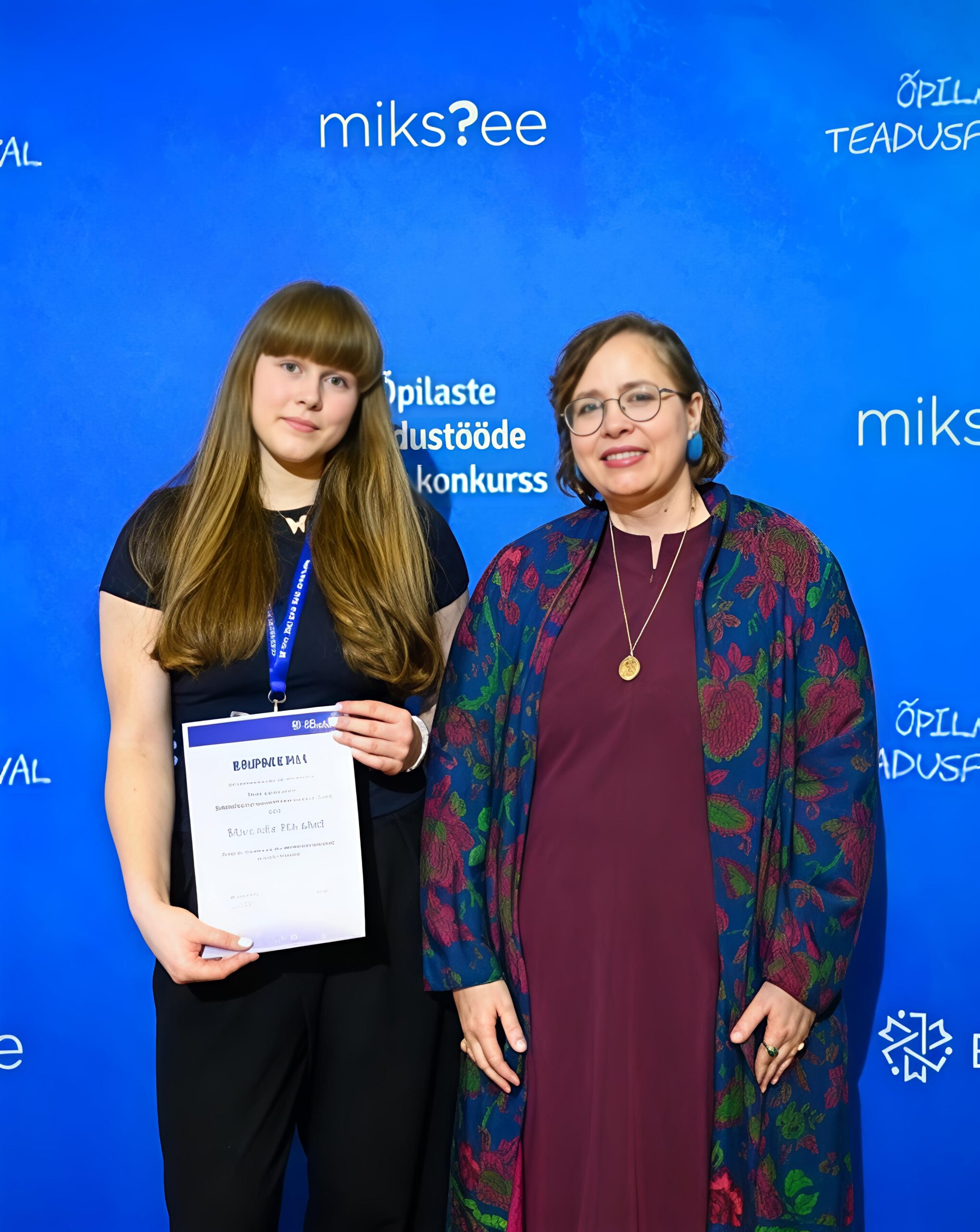 Miranda Mirabel Rajamäe (vasakul) ja õpilaste teadustööde konkursil talle tunnustuskirja andnud