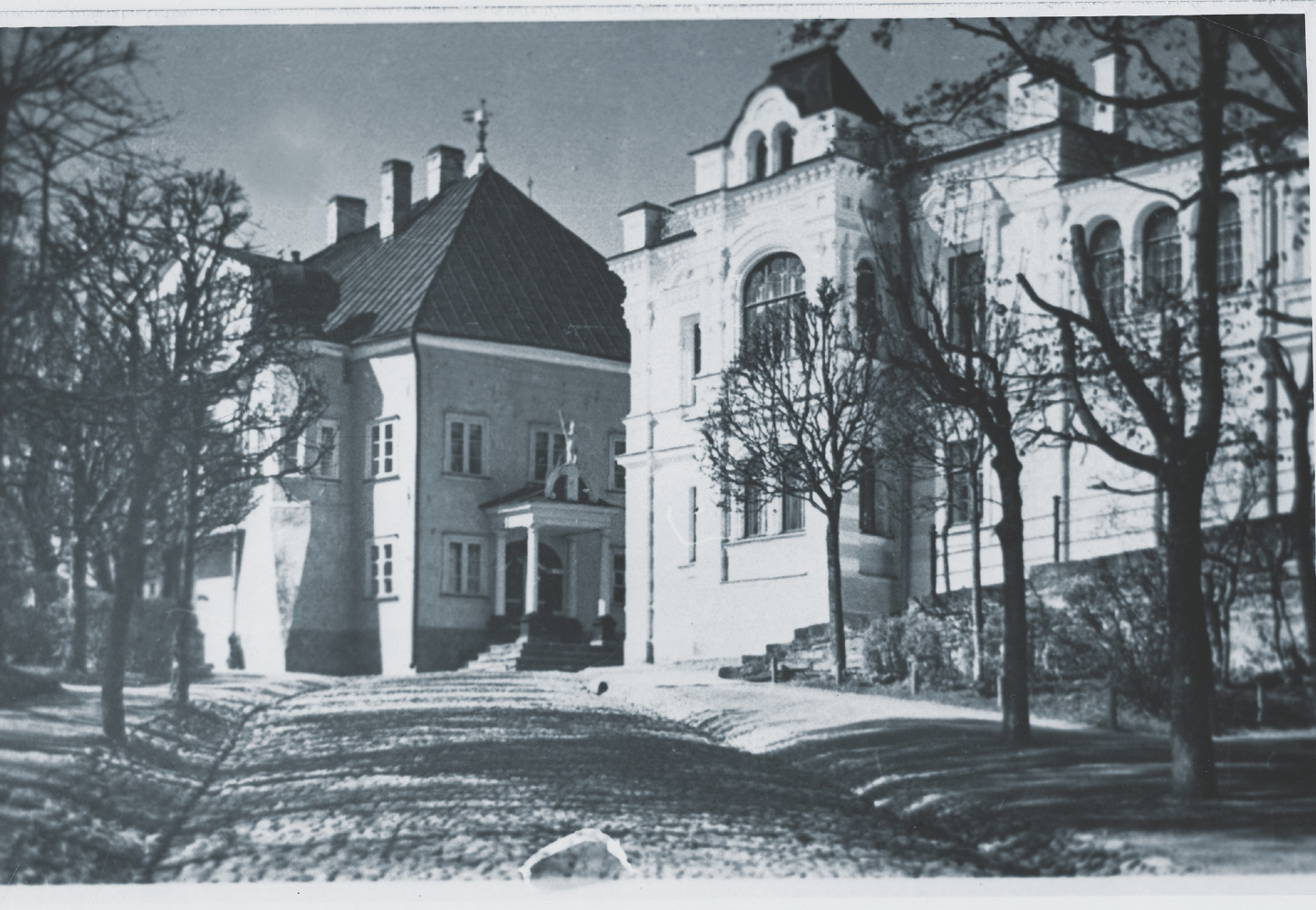 Narva linna arhiivi ja muuseumi hooned. Paremal Peeter I maja, vasakul Narva linnaarhiivi ja Lavretsovide linnamuuseumi hoone. Foto vahemikust 1930–1940. Foto: NARVA MUUSEUM