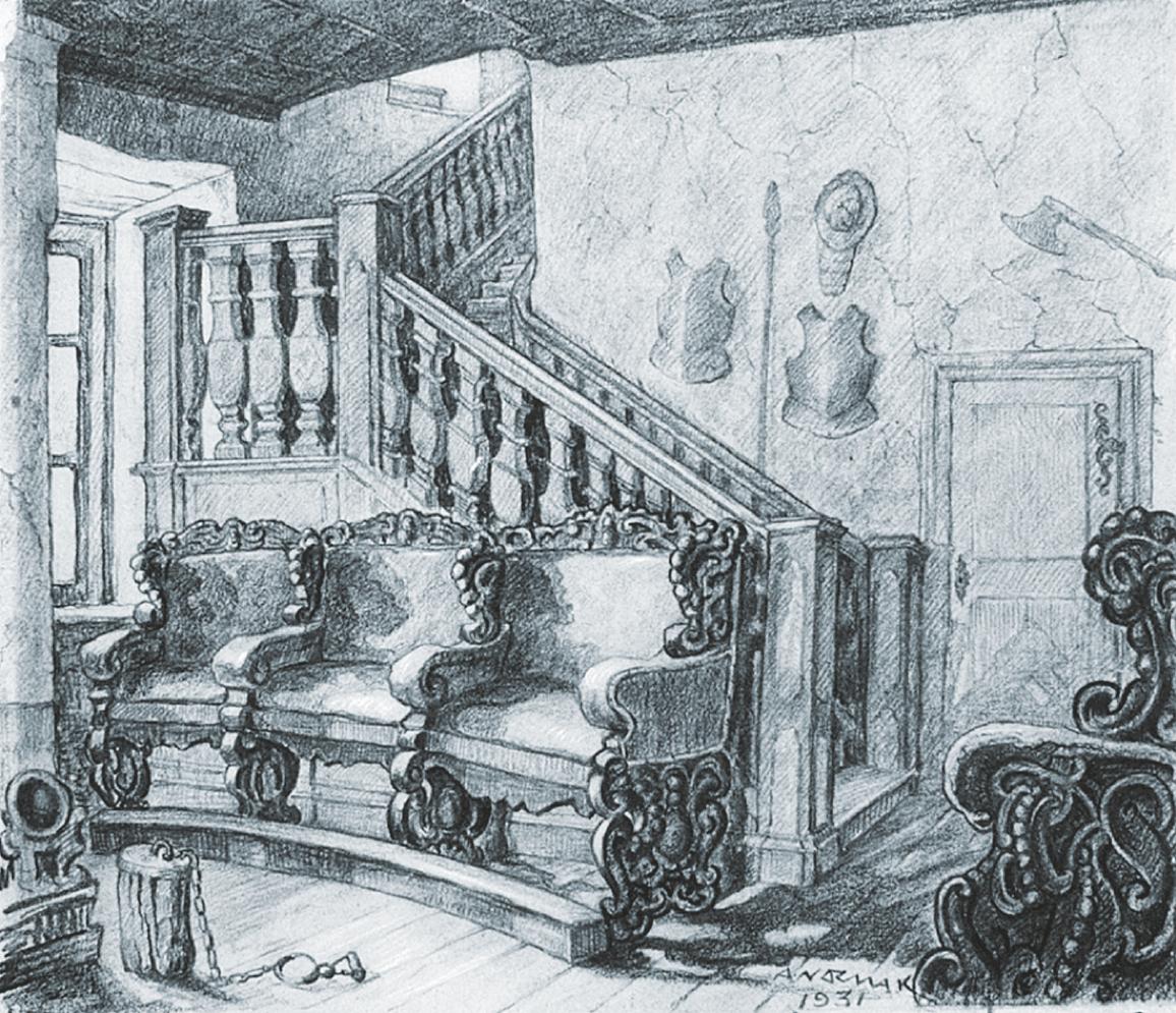 Peeter I maja trepikoda. Aleksander Normaku joonistus aastast 1931. NARVA MUUSEUM