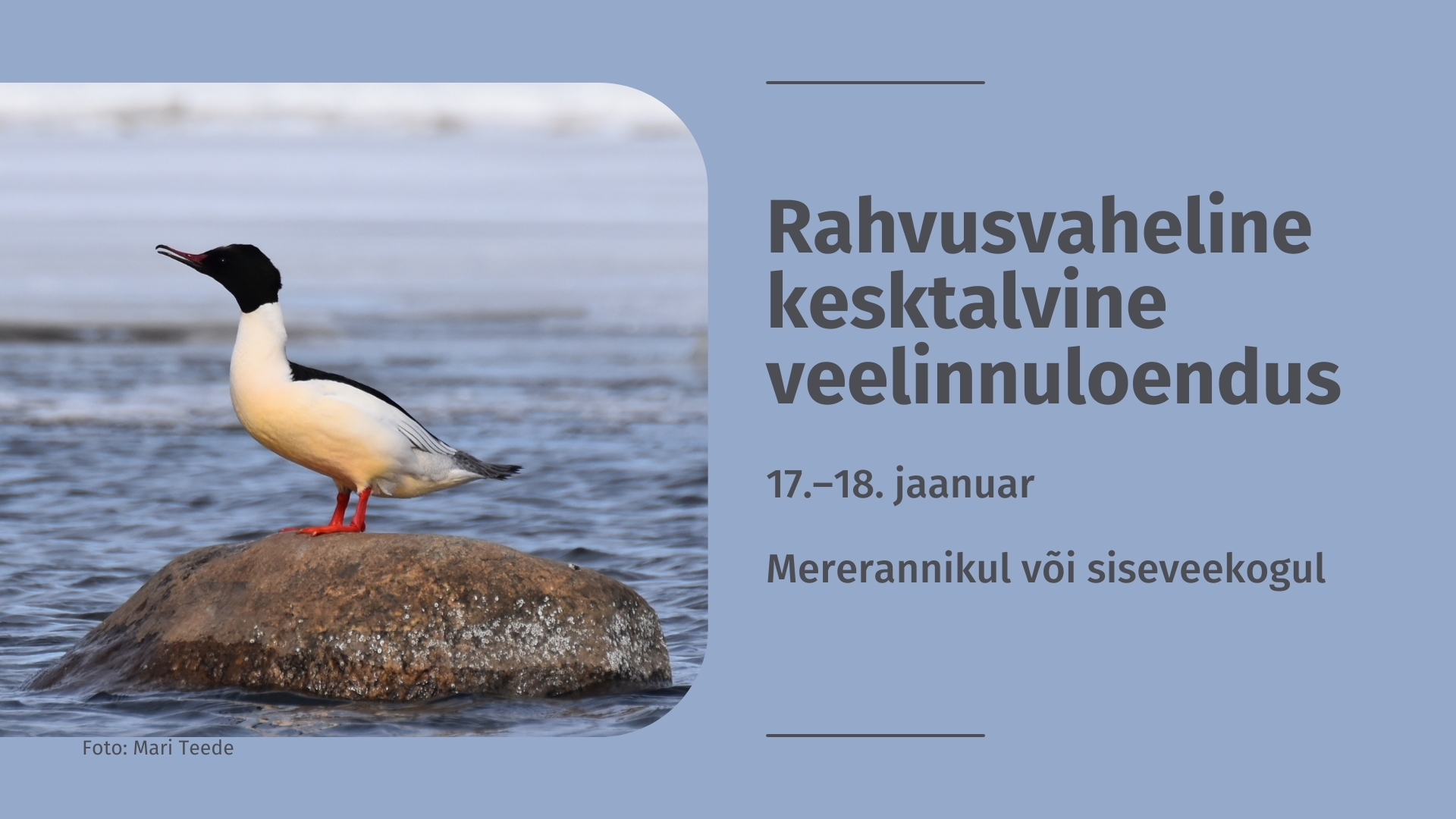 Eesti ornitoloogiaühing kutsub üles kõiki linnuhuvilisi loendama mererannikul ja siseveekogudel olevaid veelinde, et hinnata veelindude populatsiooni seisundit ja arvukust.