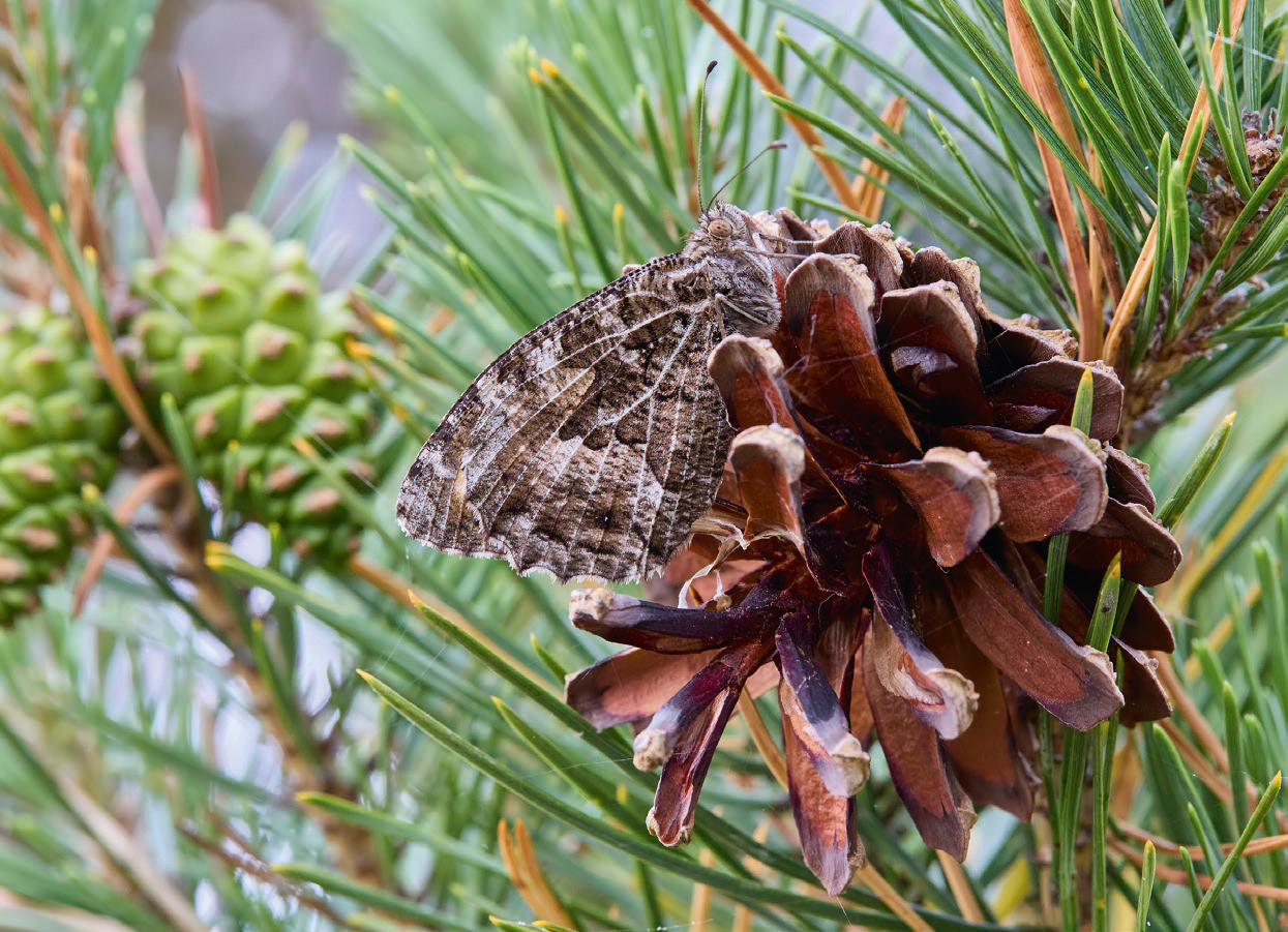 Männikäbile ööseks puhkama sättinud liblikas sulandub käbiga ühte ja jääb vaatajale tähelepandamatuks Foto: Urmas Tartes