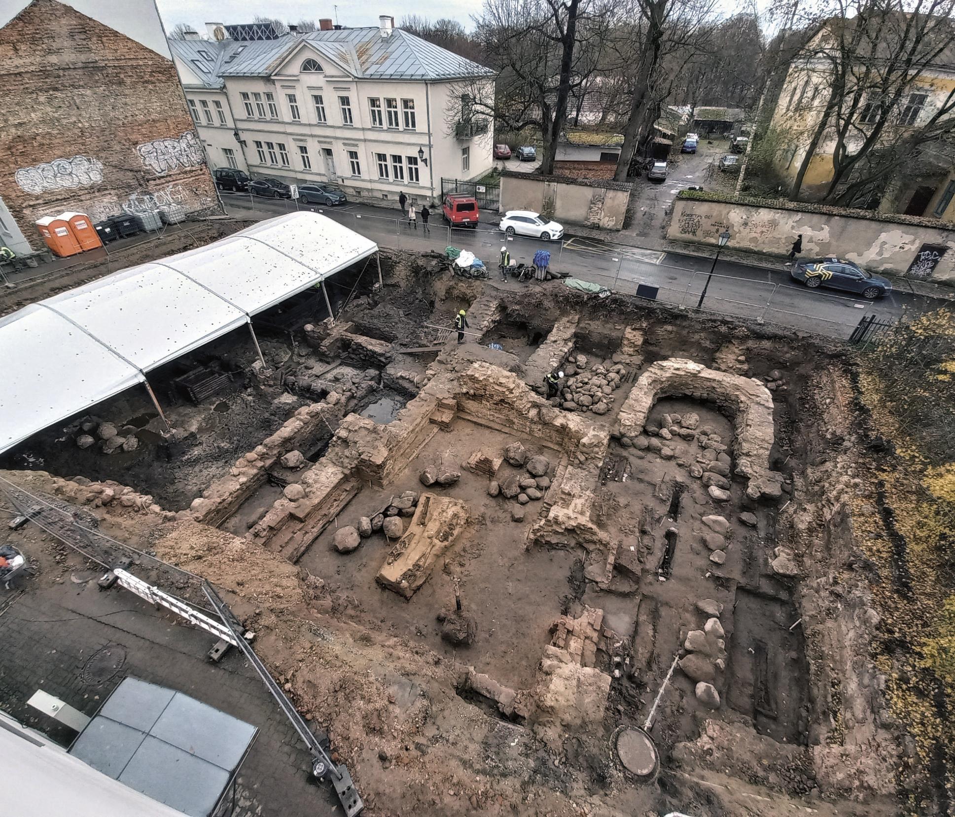 Vaade arheoloogide töömaale: vasakul on näha Nikolai kiriku müürid ja paremal tõenäoliselt jesuiitidele kuulunud pühakoja ümar apsiid. Foto: Martin Malve