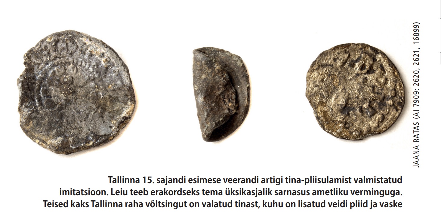 Arvatavasti tekitavad enim elevust esemed, mis kajastavad siinset eluolu vahetumalt kui hulgi käibel olnud hõberaha. Nii sisaldab Kalamaja leiukogum paarisaja 15. sajandi mündi kõrval üksikuid valerahasid, mille puhul polegi alati päris selge, kas tegemist oli mõne nurgataguse petise kätetööga või oli hansalinna raad tahtmatult sattunud mesikeelse käsitöölise ohvriks. Vanim selline leid on Tallinnas 1417.–1420. aasta vahel vermitud artigeid meenutav tina- ja pliisegust valeraha, mille tegemisel võidi kasutada kas ehtsa mündi jäljendiga valuvormi või isegi linnamüntlast pärit tööriistu. Nimelt teatakse, et toona külastas ordumeistrit seikleja, kes lubas ühest kaalumargast hõbedast lüüa uskumatult palju hõbemünte: kahekümne marga jagu. Kes teab, ehk ongi meie libaraha just tema kätetöö? Kaks ülejäänud võltsingut jäljendavad 1420. aasta mündireformi järgseid Tallinna penne, seega on koha peal olnud teisigi, kes hoolimata silme ees pidevalt terendavast surmanuhtlusest läksid välja riski peale matkimaks hõberahasid.
