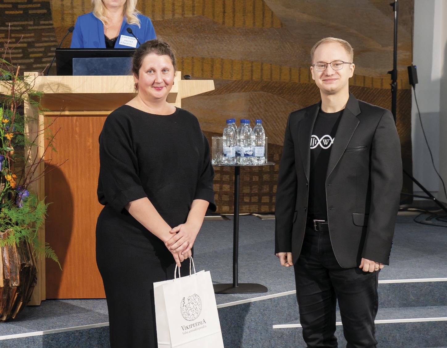 Artikli autor Darja Lavõgina (pildil vasakul) võitis Vikipeedia 2024. aasta terminivõistluse. Auhinna andis talle kätte Vikipeedia eestvedaja Ivo Kruusamägi. Foto: OLARI PILNIK / WIKIPEDIA